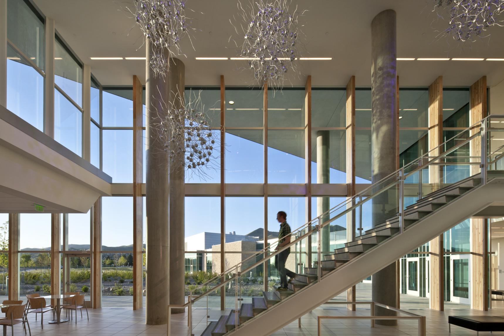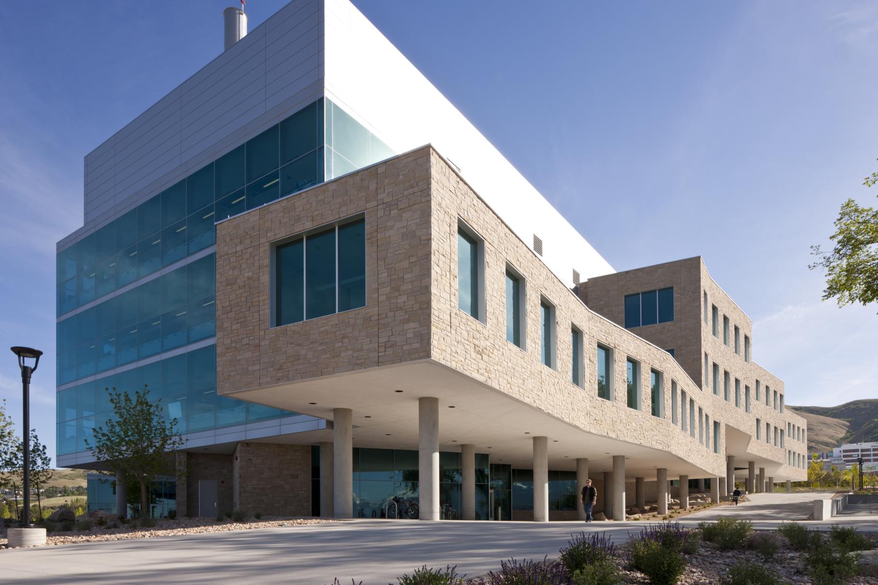 The James LeVoy Sorenson Molecular Biotechnology Building (SMBB), located on the new 11-acre Interdisciplinary Research Quadrangle, stands as a cornerstone of innovation at the University of Utah. The 205-square-foot facility, envisioned as a USTAR Innovation Center, is tailored to catalyze transdisciplinary research in Biomedical and Neuroscience fields while fostering the growth of new businesses in engineering, advanced technologies, and medicine within Utah. Designed to accommodate twenty-four principal research investigators and their teams, SMBB integrates diverse scientific investigation strengths, driving scientific innovation and facilitating the commercialization of research. The building's architectural design prioritizes collaboration, featuring a multi-level "Town Square" that connects various research neighborhoods and serves as a vibrant hub for interaction. This central atrium, inspired by the surrounding mountains' canyons, offers breathtaking views of the Salt Lake City Valley and promotes a sense of unity and connectivity. Sustainable and energy-efficient design principles, combined with carefully selected materials and natural lighting, underscore the building's commitment to environmental responsibility with LEED Gold certification. Energy efficiency, high performance systems, access to natural light and carefully selected materials all contribute to the environmentally sensitive design approach. This project was designed in collaboration with Prescott Muir Architects.