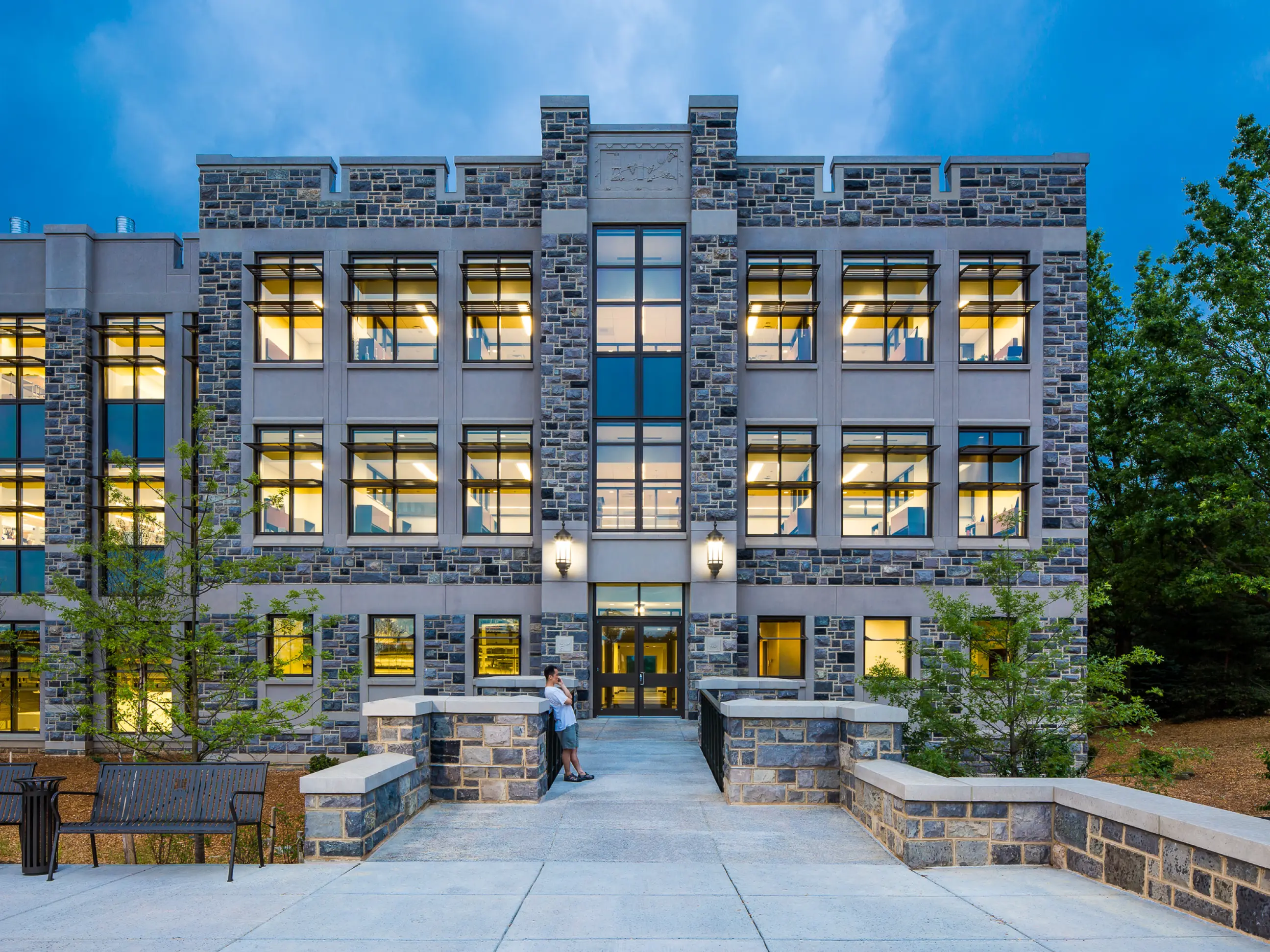 The Human and Agricultural Biosciences Building 1 (HABB1) at Virginia Tech features advanced laboratories designed for research in microbiological and biochemical fields, including food safety, bio-fuel cells, and environmental quality analysis. The labs are equipped with high-bay spaces for large-scale equipment, offering flexibility in utility access and loading requirements. Natural light permeates the labs through clerestory windows and extensive glazing, minimizing reliance on artificial lighting. Sustainable design elements include a chilled beam HVAC system that efficiently maintains indoor air quality and temperature while reducing energy consumption. The facility’s commitment to sustainability extends to the use of low-VOC materials, recycled content, and stormwater management strategies, all contributing to its LEED Gold certification. These laboratories support critical research while aligning with high-performance environmental standards.