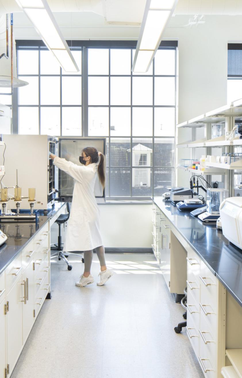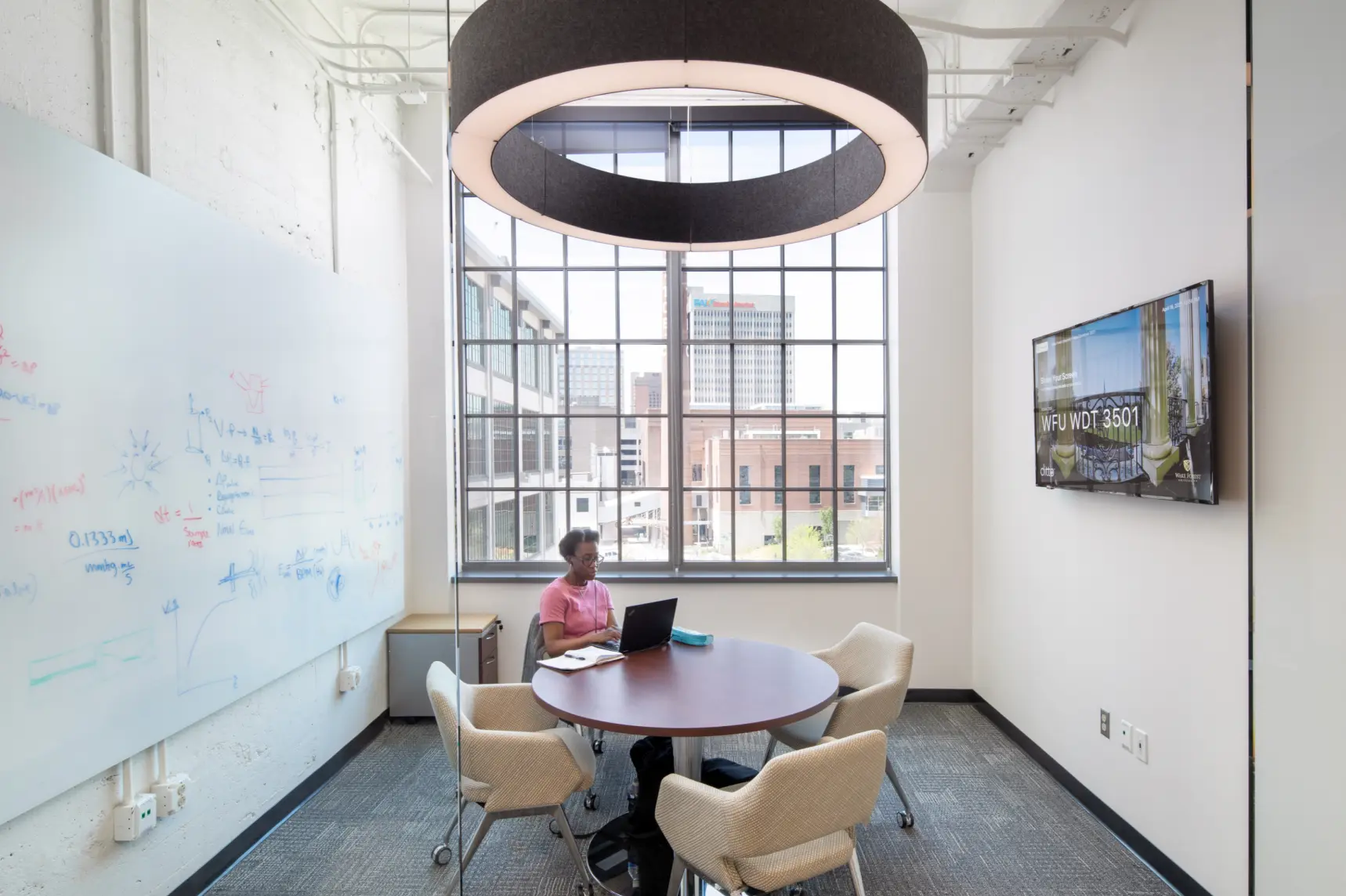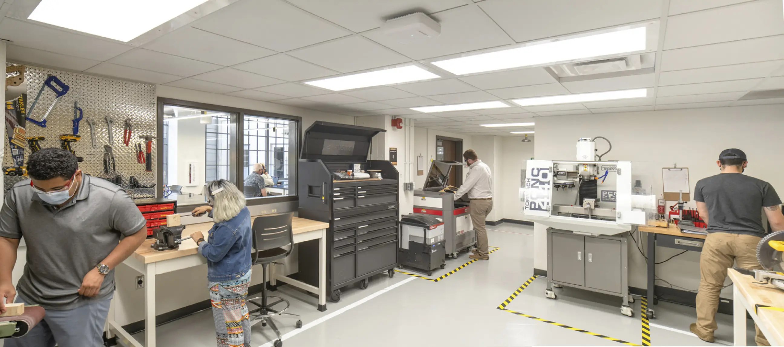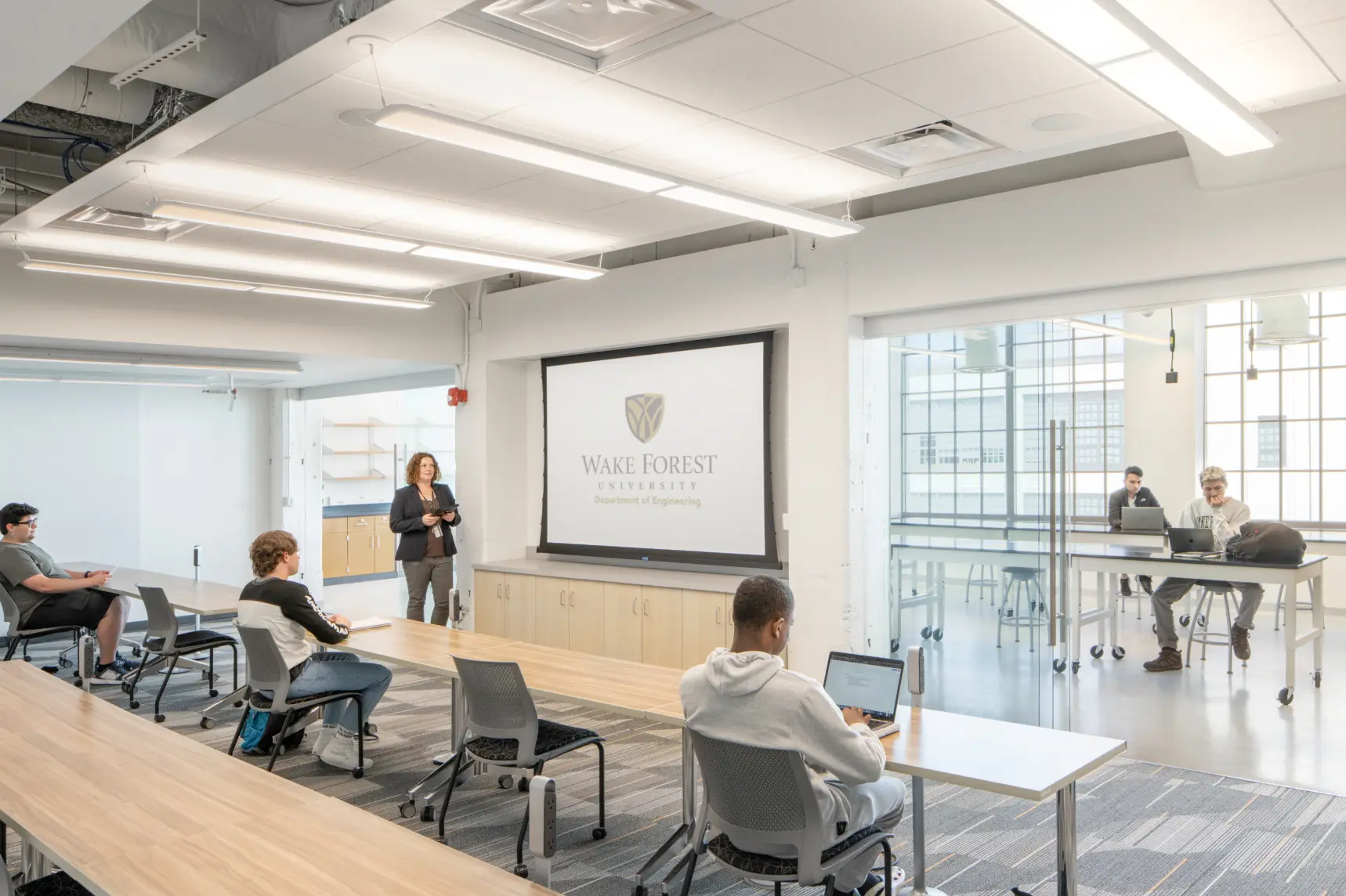 In 2017, newly approved courses of study in Engineering, Biochemistry and Molecular Biology, and Medicinal Chemistry and Drug Discovery anchored the University’s undergraduate presence at Wake Downtown, located in Wake Forest Innovation Quarter. These programs, along with other planned academic, community, and social opportunities, are housed in a rehabilitated R.J. Reynolds Tobacco Company 60 series building, adjacent to the new space for the medical education programs of Wake Forest School of Medicine. Lord Aeck Sargent undertook the renovation, reprogramming, and re-envisioning of the existing historic warehouse building to create a 16,000 sf project spread across four levels. The design includes new, flexible teaching studios and classrooms, teaching labs, research labs, and the Innovation Studio, which features makerspace with 3D printers, solder stations, circuit board printers, and a machine shop. The result is bright, active classrooms, labs, and collaboration spaces that support a dynamic teaching and research program, enhancing the educational experience for the growing Engineering Department at Wake Downtown.