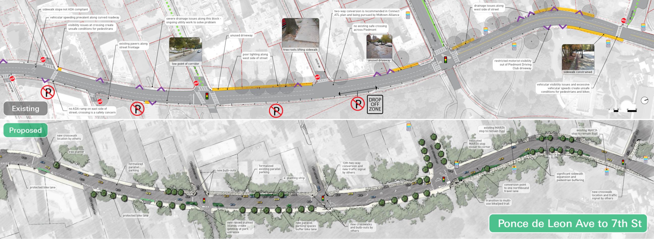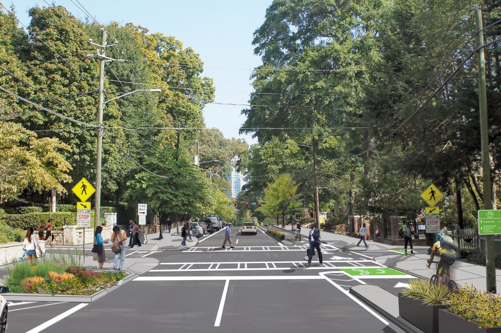 Lord Aeck Sargent, in collaboration with Midtown Alliance and Renew Atlanta, spearheaded the redesign of a 1.1-mile corridor of Piedmont Avenue, a crucial north-south artery linking Atlanta’s Downtown, Midtown, and Buckhead areas. Partnering with Kimley-Horn on transportation strategy, the firm led an in-depth analysis of the corridor's safety issues, underutilized spaces, and ADA non-compliance, which informed the design of comprehensive "complete street" solutions. The concept prioritized pedestrian and cyclist safety by integrating a northbound protected bike lane aligned with five existing routes, reducing vehicular speeds through targeted traffic-calming measures, and formalizing on-street parking to enhance accessibility. Pedestrian connectivity and ADA accessibility were addressed through improved crosswalks, multi-use pathways, and curb ramps, while stormwater planters were strategically incorporated to mitigate runoff impact. Through a collaborative public engagement process, Lord Aeck Sargent’s landscape strategy set a foundation for transforming Piedmont Avenue into a more balanced, multi-modal urban environment.