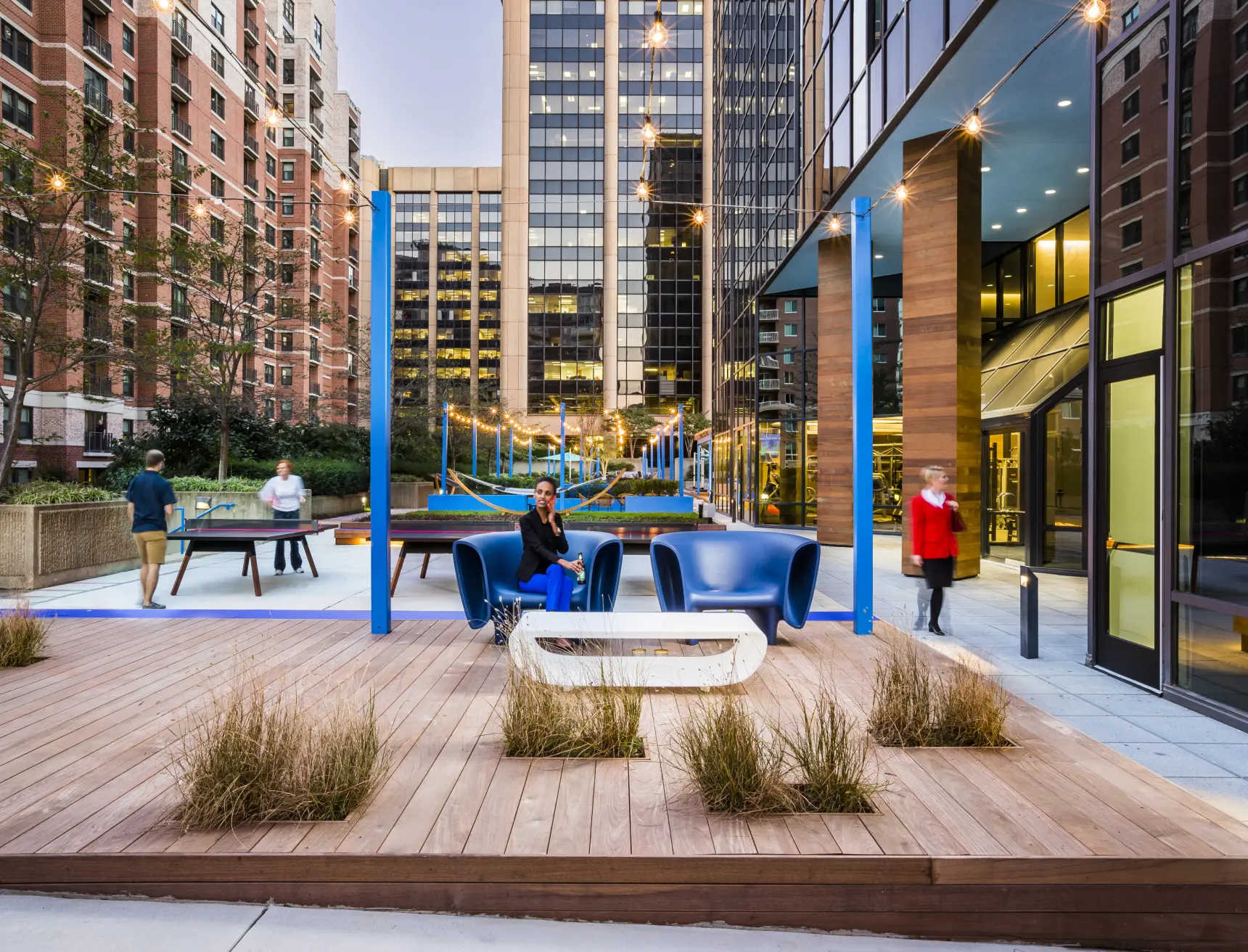 The 4501 Ford Ave e-lofts project in Alexandria, Virginia, reimagined by Lord Aeck Sargent, involves the adaptive reuse of a 14-story office building originally constructed in the 1980s. This transformation creates approximately 200 flexible live/work loft spaces designed to accommodate both residential and office functions within the same units. These units, ranging from 650 to 1,200 square feet, feature 10-foot exposed ceilings, large windows, movable pocket walls, Euro-style kitchens, walk-in showers, and full-size washer/dryers, with robust IT infrastructure. The design emphasizes the building’s original tall ceilings and open floor plans, aligning with its office architecture. The conversion includes maintaining the four-level below-grade parking structure and integrating roughly 7,200 square feet of common amenities on the ground level to support the mixed-use environment. In collaboration with Gensler for interior design and visioning, the project demonstrates a commitment to sustainability and responsive design by leveraging existing structures and integrating shared spaces such as a rooftop patio and sports areas, providing a cohesive living environment to meet contemporary demands for versatile living and working spaces.