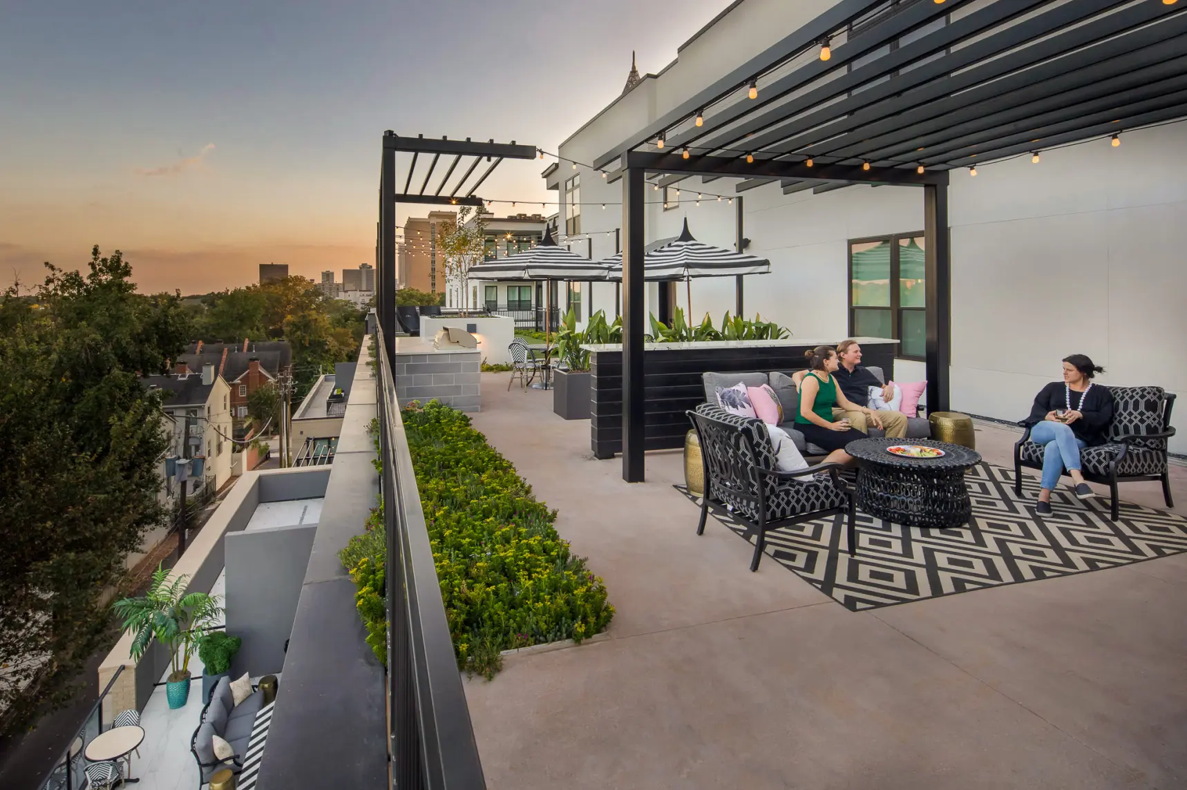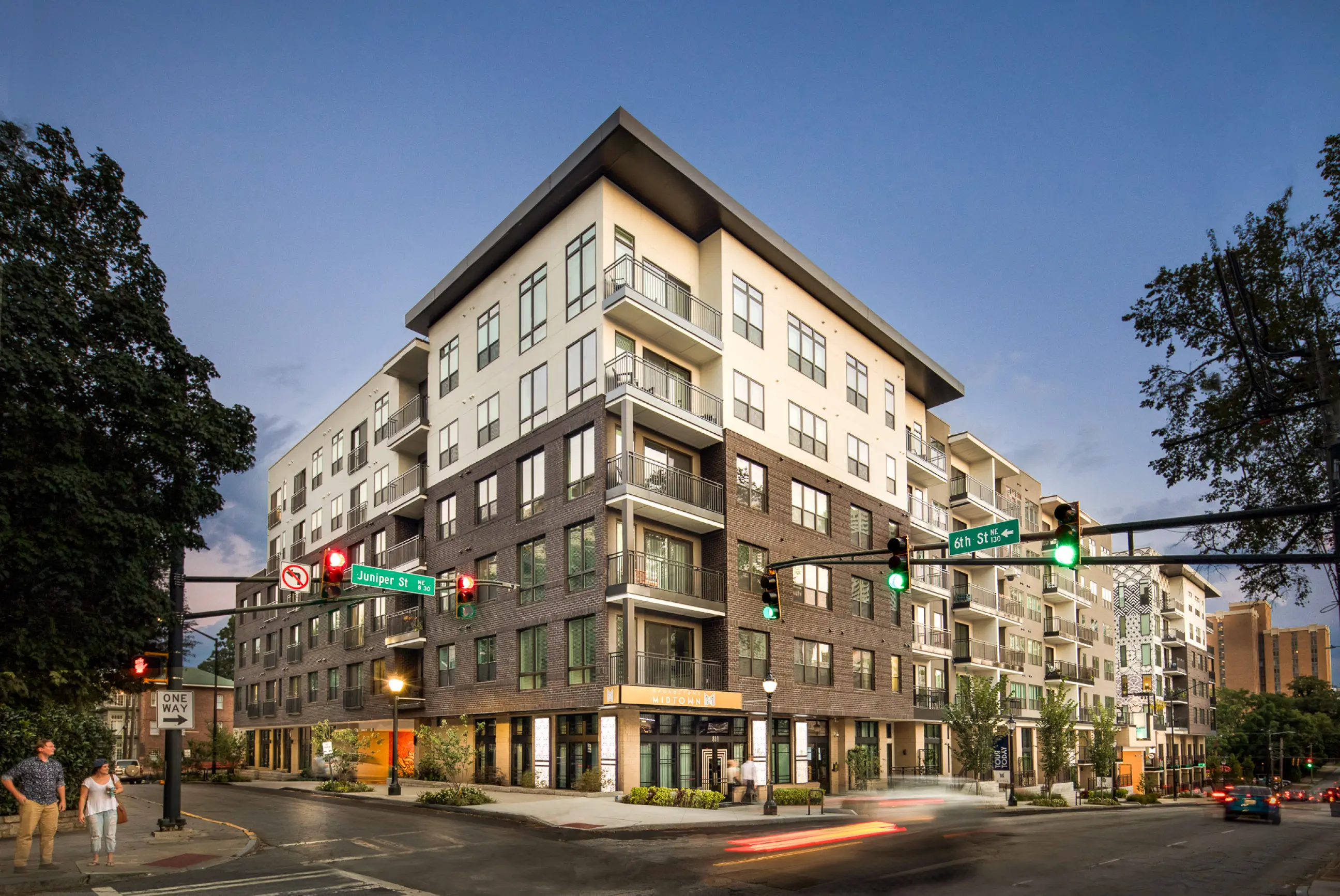 Axis Midtown (formerly Broadstone Midtown), located at the southeast corner of Juniper and 6th Street in Midtown Atlanta, epitomizes urban living through its unique architectural approach and context-driven design. This multifamily residential project, developed by Lord Aeck Sargent, features five residential levels atop a podium with structured parking for 230 cars, leasing offices, and street-accessible live/work units. The design integrates large community terraces that extend the living spaces and offer views of the Atlanta skyline and surrounding neighborhood, fostering a connection with the vibrant Midtown atmosphere. The building’s mid rise architecture and boutique hotel-inspired interiors provide residents with an intimate and individual living experience. Amenities include a fitness center, bike storage and repair facility, dog grooming room, fenced dog park, clubroom, and multiple terraces. Sustainable features such as energy-efficient lighting, low-flow plumbing fixtures, and NGBS Bronze Certification emphasize the project's commitment to environmental responsibility. Challenges addressed in the design included respecting community heritage during site development and adhering to transitional height plane requirements, resulting in creatively stepped outdoor terraces. Axis Midtown’s strategic location ensures accessibility to public transit, Piedmont Park, local dining, entertainment, and employment hubs, contributing to the dynamic and integrated urban lifestyle envisioned by Lord Aeck Sargent.