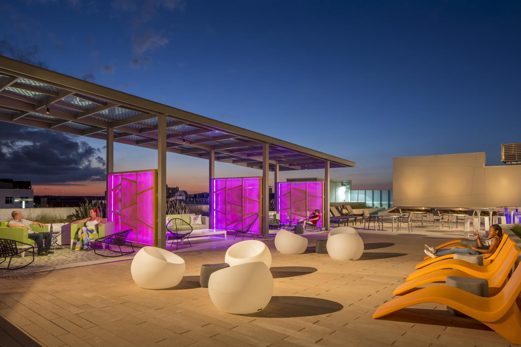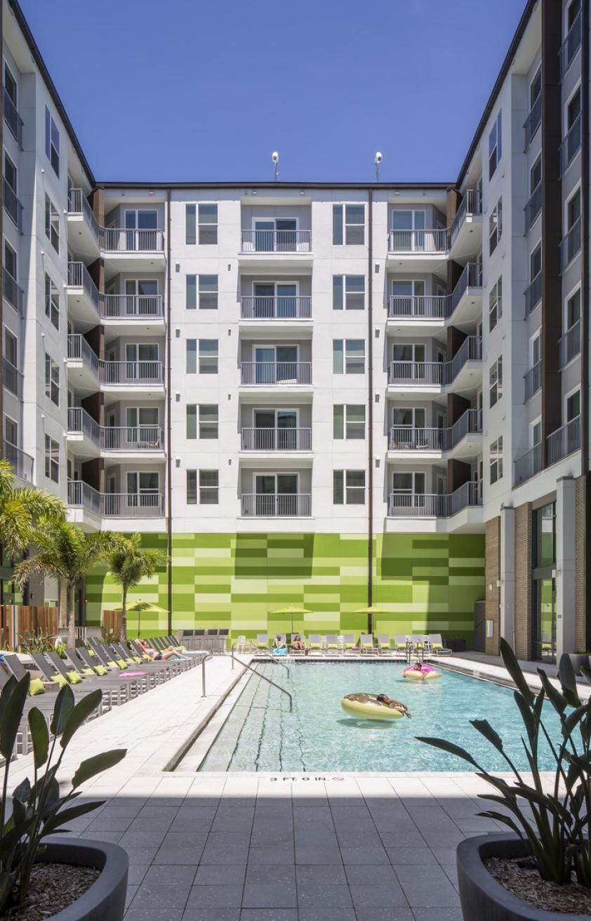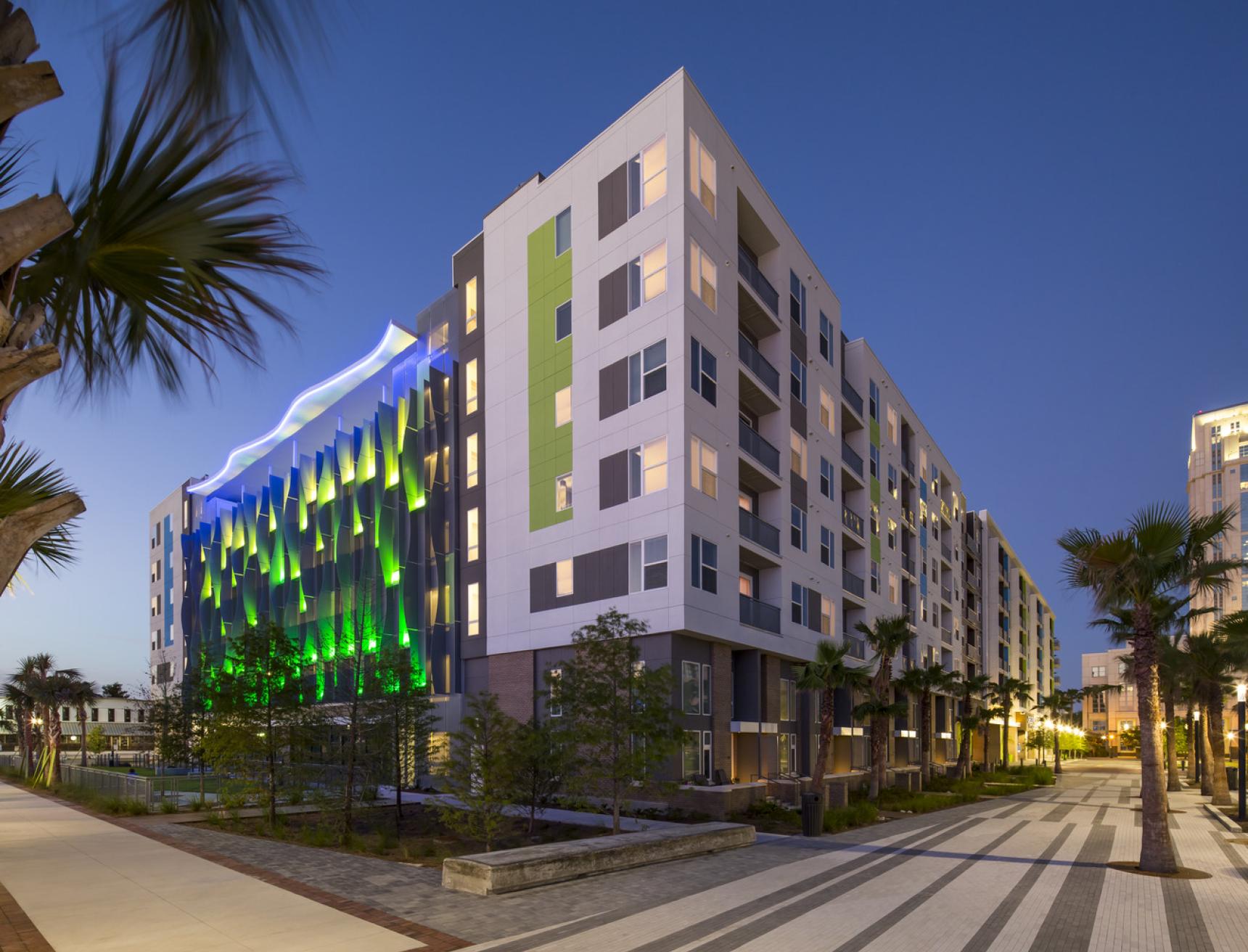 Central Station on Orange (formerly Crescent Central Station) is a multifamily housing development in downtown Orlando, strategically positioned between a multi-modal transit station and Orlando City Hall. This project features 275 luxury apartments equipped with modern amenities such as a pool courtyard, clubroom, fitness center, pet grooming salon, and bicycle repair shop. The building design includes a six-story structure of wood framing over a double-height concrete level, encompassing a seven-story parking deck with 400 spaces. A linear park separates the building from active transit rails, with green façades extending the park's lush environment. This mixed-use development integrates 13,000 square feet of retail and restaurant spaces at street level, enhancing urban connectivity and community engagement. Future phases anticipate the addition of a hotel, office buildings, and more parking, reflecting a holistic approach to urban development.