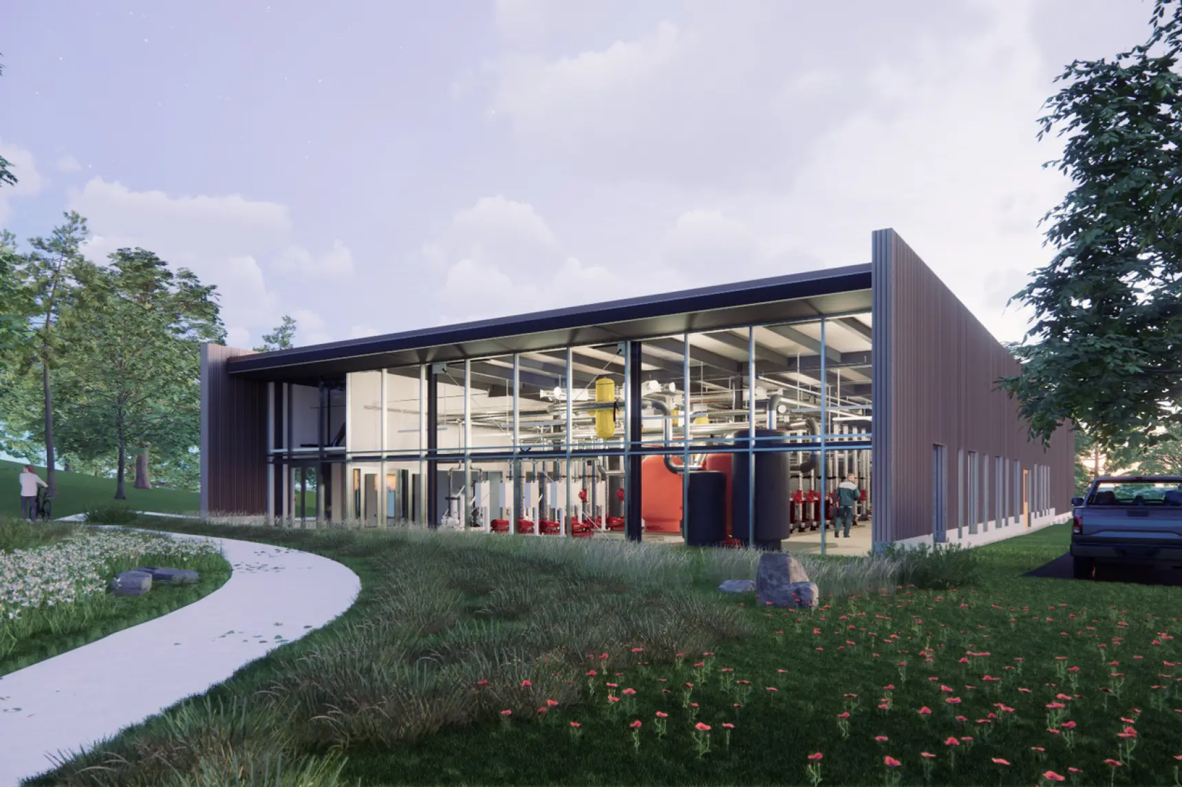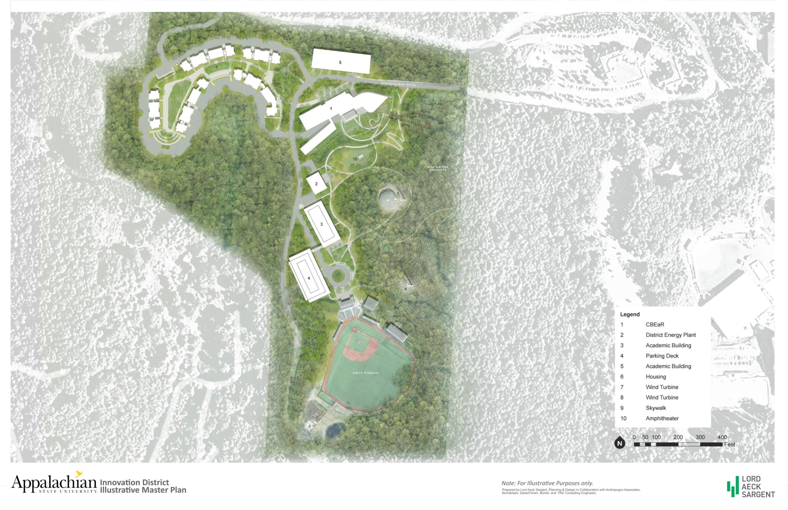 The Appalachian State University Innovation District master plan focused on the creation of a 28-acre learning district involving the synthesis of three main components: Buildings—including housing and three research and academic buildings; Energy—a district wide energy system with over 500 geothermal wells, 4 wind turbines, and a central energy plant; and, Site—the unifying element for the district consisting of performative native landscapes that will accent ASU’s “Campus in a Forest” identity and connect the district as a whole. Given the spatial constraints of the site and the spatial needs of these elements, a key element to this plan was an implementation framework that accounts for the synergies between these elements to allow for a holistic realization of the vision.