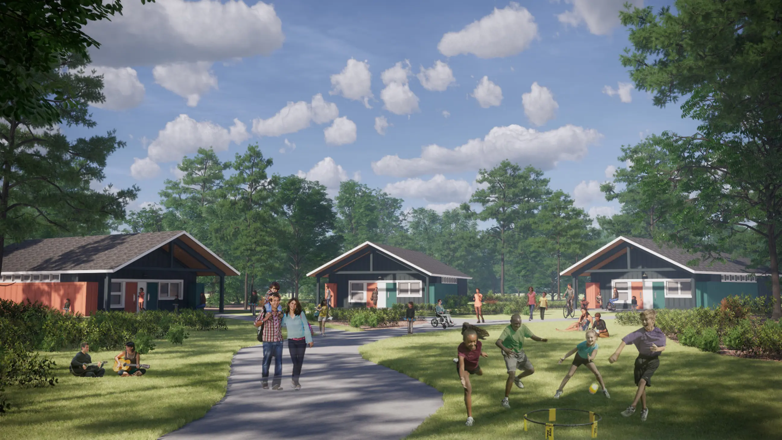 The primary organizing element, a large active oval, situates the supporting buildings into the landscape. The expansion’s facilities will include dining for 300 campers, a large gymnasium, outdoor athletic spaces, light medical services, spaces dedicated to arts-focusedcurriculum, guest staff housing, a swimming pool customized to campers with life challenges, an outdoor water activity center, a terraced gathering space with views to the lakes, and 20 new camper cabins designed for maximum flexibility and future growth.