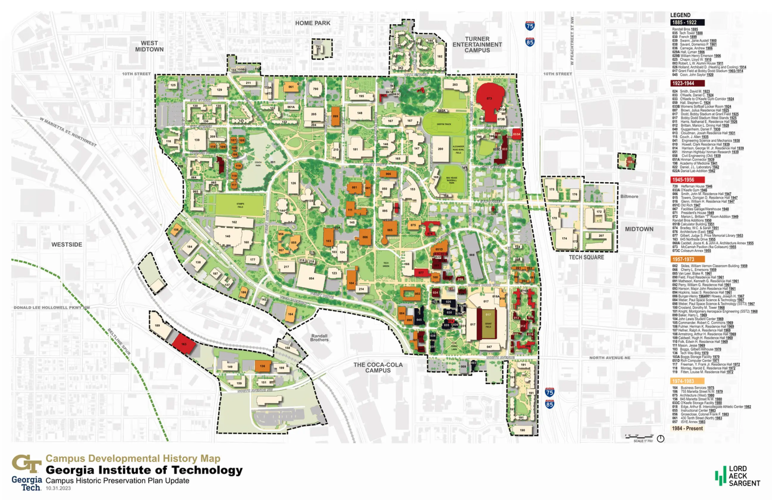 The Georgia Institute of Technology engaged Lord Aeck Sargent’s Historic Preservation Studio to prepare its Campus Historic Preservation Plan in 2002 and 2009, and LAS is currently updating the plan. Designed with three primary objectives, the plan outlines the Institute’s existing cultural resource policies with recommendations to ensure compliance with the seven standards of the Stewardship Program; serves as a manual for Institute personnel by detailing both general and specific operating procedures to guide responsible treatment and management of cultural resources; and presents the Institute’s intentions regarding its cultural resources for review by the Board of Regents and the Historic Preservation Division.